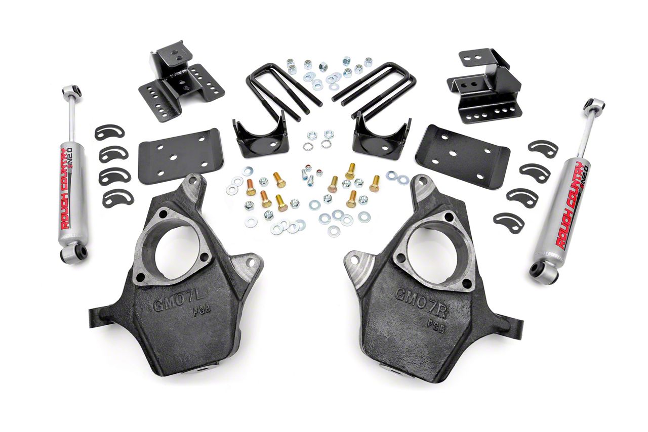 Versatile Lowering Kit. If you’re thinking of lowering your 2WD Silverado, but are worried about changing your truck’s ride quality then the Rough Country 2 inch Front, 4 inch Rear Spindle Lowering Kit is what you need. The Rough Country lowering kit gives your truck a 2-inch drop up front and 4 inches at the rear without altering its ride quality, since the factory’s general suspension geometry is maintained. What’s more, the rear drop is adjustable between 4 and 4.5 inches; and if you need to, you can return your truck to stock height without any issue.