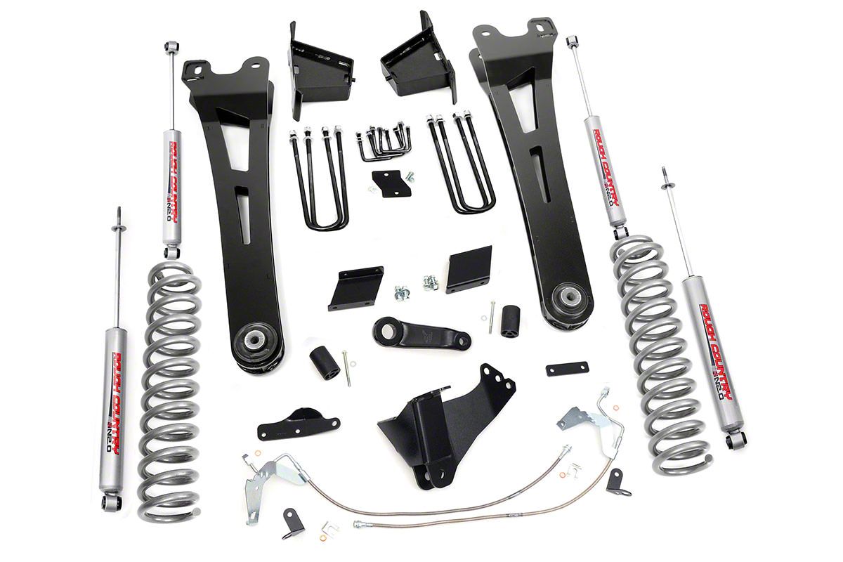 Aggressive Stance with Improved Performance. The Rough Country 6-Inch Radius Arm Suspension Lift Kit with Premium N3 Shocks is built to handle your Super Duty’s on and off-road demands. This suspension lift system is an exceptional upgrade that will provide enhanced off-road driveability and additional support to your lifted F-250. This performance lift kit includes durable front and rear Premium N3 shocks, heavy-duty radius arms, high-strength coil springs, track bar and sway bar relocation brackets, rear blocks and U-bolts.