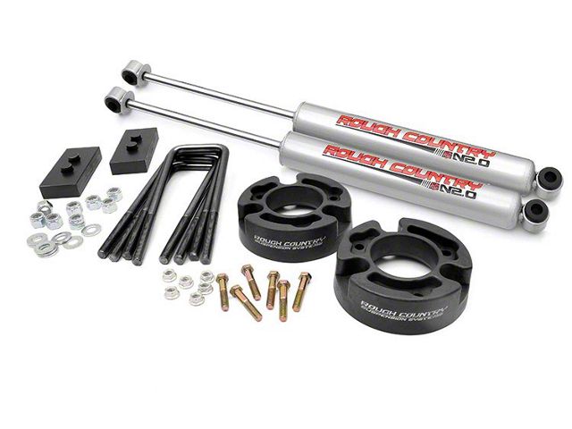 Premium Front Strut Spacers. Rough Country 2.5 in. Leveling Lift Kit w/ Shocks comes with all of the pieces you need to make your F-150 look and feel great. This kit comes with the front strut spacers, so you do not have to worry about finding them elsewhere and with an easy installation, you do not have to take apart your suspension to use them. In addition, this kit comes with rear lift blocks that can be used in conjunction with the other parts to provide you with the look and stance you are after.