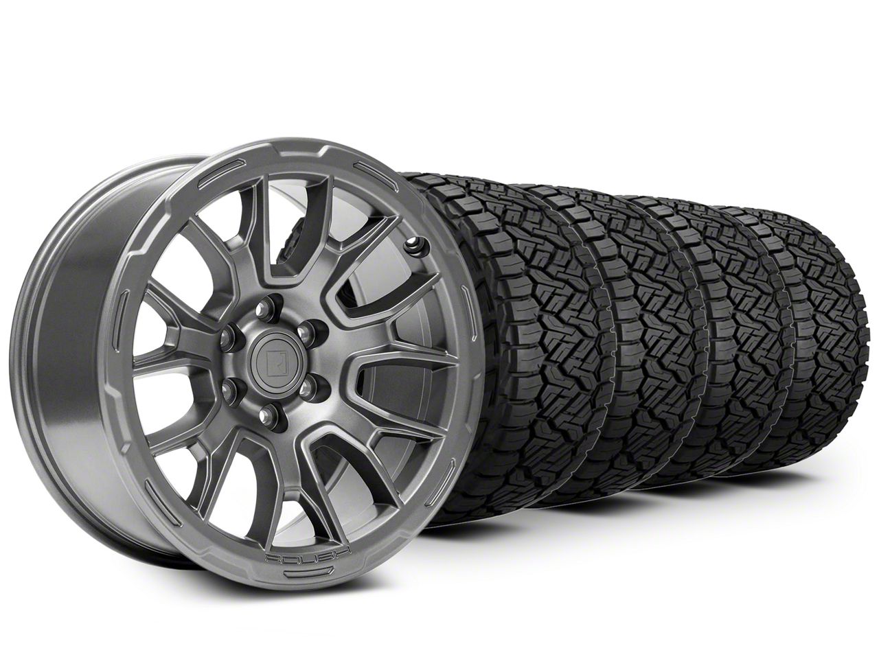 Mounted and Balanced Wheel and Tire Kit. This wheel and tire combo kit features (4) 20x9 Iridium Gray 6-Lug Wheels and (4) NITTO All-Terrain Recon Grappler 33x12.50R20 tires that have been put together into an easy to buy kit that arrives to your door already mounted and balanced ready to be installed on your vehicle.