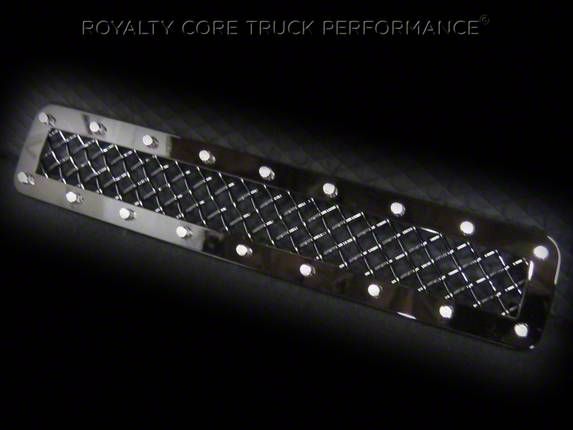 Royalty Core's proprietary corrosion resistant stainless technology creates the most durable grille on the planet. It's engineered to exploit the cleanest installation possible for your specific truck model. This Royalty Core grille is customized to best match your truck with military grade strength you can count on such as a 12 gauge stainless steel construction, optimal mounting brackets, CNC precision machined brackets, frame, and logos, hand fabricated, all gloss surfaces are buffed to a deep smooth mirrored finish, triple chrome plated T304 stainless studs around frame with star flange design, stainless super woven mesh, and absolutely no plastic. Royalty Core offers the industry's largest customized line of grilles and logos available.
