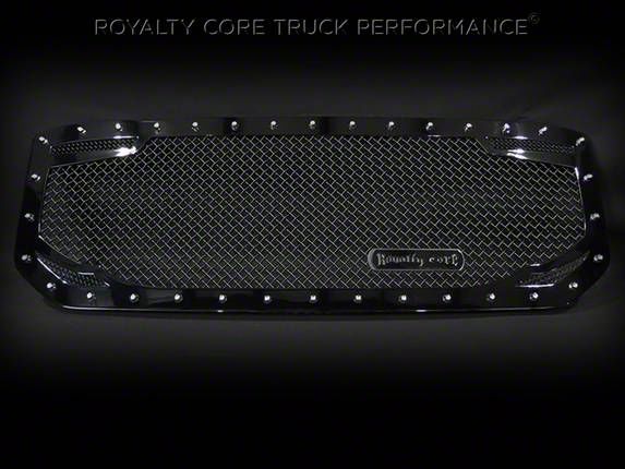 Construction and Appearance. Constructed from military-grade 12-gauge stainless steel, this grille insert ensures durability and resistance to impact. It features a race-proven diamond mesh pattern and is finished in a sleek gloss black. Additionally, it boasts Royalty Core's iconic T304 stainless steel triple chrome studs, adding a distinctive touch to its design.