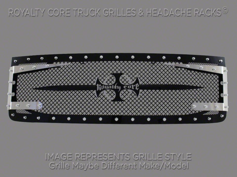 Innovative Grille Design. The Royalty Core RC3DX Innovative Upper Grille Insert; Gloss Black transforms the front end with its aggressive, raised graphics that are elevated one inch for a three-dimensional appearance. It enhances airflow and provides superior protection, making it ideal for trucks that demand style and durability on and off-road.