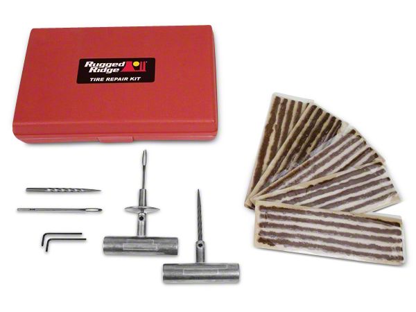 Fix, Don't Swap Out. The Rugged Ridge Tire Repair Kit is an important addition to your off-road tool kit for your vehicle. The heavy-duty storage case is made from very visible red plastic and doesn't take up much room. Instead of having to stop and take time to change out a flat tire with your spare, it's quicker to simply repair the hole for a temporary solution.