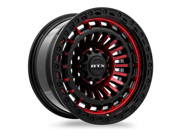 RTX Offroad Wheels Moab Gloss Black Machined Red 6-Lug Wheel; 17x9; 0mm Offset exudes a sleek aesthetic appeal, complementing a range of vehicle styles. Its dark stainless finish emanates sophistication, while the brand reputation of RTX Offroad Wheels ensures robustness. This wheel seamlessly merges elegance with durability.