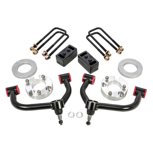 The Complete Kit. The suspension lift kit includes high-quality and pre-matched components such as upper control arms in tubular steel, CNC-machined billet aluminum top strut extensions, preload spacers for the lower spring, cast iron rear lift blocks, and rear U-bolts. All necessary hardware for a trouble-free fitting is also included in this kit.