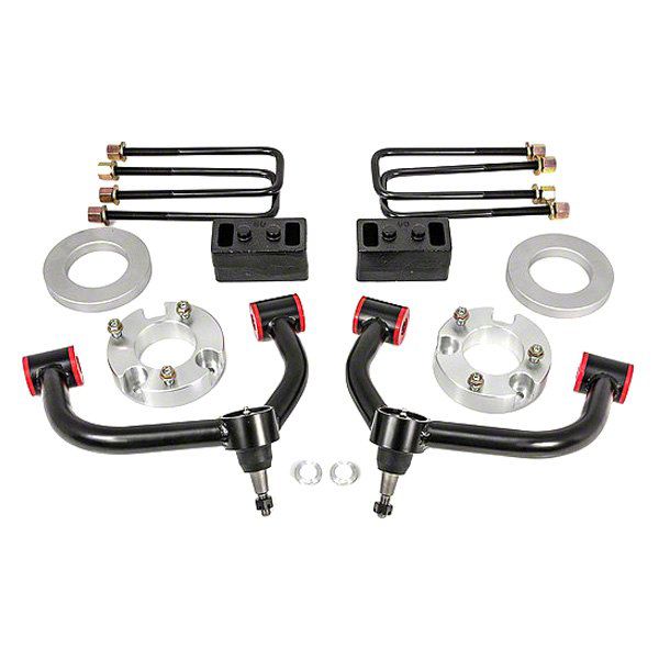 Quality Components. This suspension lift kit consists of tubular steel upper control arms with correct pivot angle, CNC -machined billet aluminum top strut extensions with a lower spring preload spacer that will control suspension travel while providing a comfortable ride. This kit also comes with cast iron rear lift blocks and rear U-bolts.