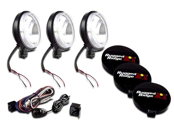 Trail Tough. Each of these Rugged Ridge HID Off Road Fog Lights uses only 35 watts, but outputs the rough equivalent of a 100-watt halogen fog lamp. The three lights combined create a wall of close-focused light to cut through fog, rain, and snow. The shallow pattern also helps illuminate obstacles along the trail during nighttime explorations. Rugged Ridge uses stamped steel casings with a corrosion-resistant black finish. All wiring connections are wateproof. The mounting brackets are multi-direction adjustable. Rugged Ridge backs this kit with a 5-year warranty.