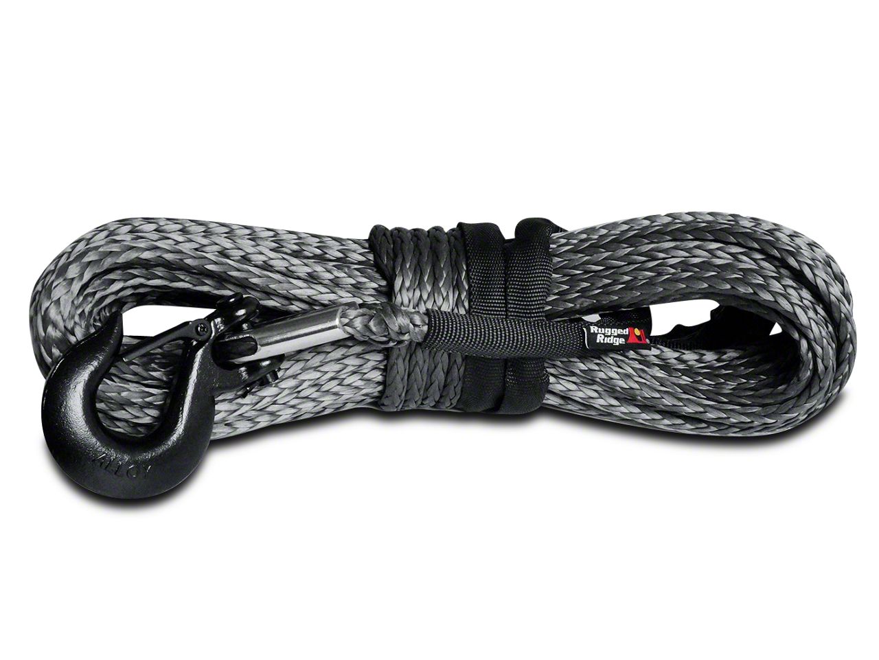 Be Prepared. When you're out on the trail, a snapped recovery line is the last thing you want to experience when trying to pull you or a friend out of a tough situation. Traditional steel lines can snap much easier than this Rugged Ridge 7/16 in. x 90 ft. Dark Gray Synthetic Winch Line, which can pull 22,500 lbs. before breaking, making sure it will get you out of the most extreme binds.