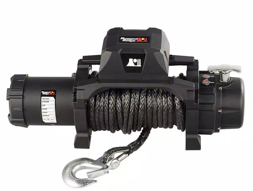 Powerful Pull. Get ready to conquer any off-road challenge with the Rugged Ridge 10,000 lb. Trekker Winch with Synthetic Rope. This winch is designed to provide reliable and powerful performance in any situation. With a 3-stage planetary gearbox and a 216:1 gear ratio, this winch delivers the pulling power you need to overcome obstacles and get out of tough spots with ease.