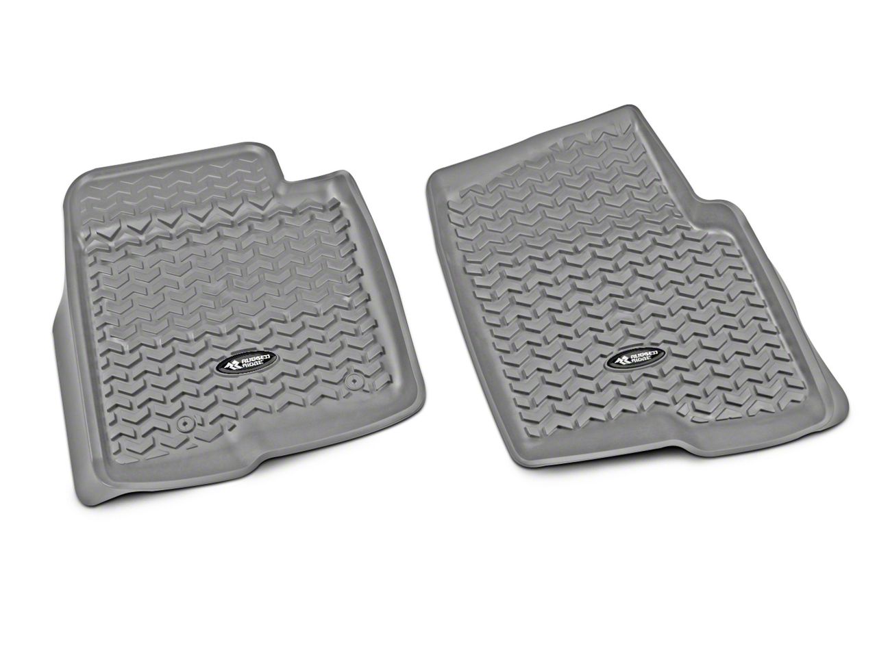 Patented Chevron Tread. Far superior to a simple piece of cheap plastic under your feet, these Rugged Ridge Front Floor Liners feature a patented deep tread in a Chevron shape that directs and channels the liquid away so your shoes stay dry.