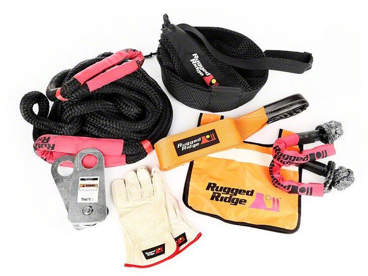 Convenient Pack-and-Go Recovery Kit. The Rugged Ridge Premium Recovery Kit with Mesh Bag gives unrivaled confidence in all your off-road adventures. The kit comes packed with all relevant equipment that you might need in the case that you need to conduct a recovery. You can now rule even the roughest and trickiest terrains without fear of getting stuck.