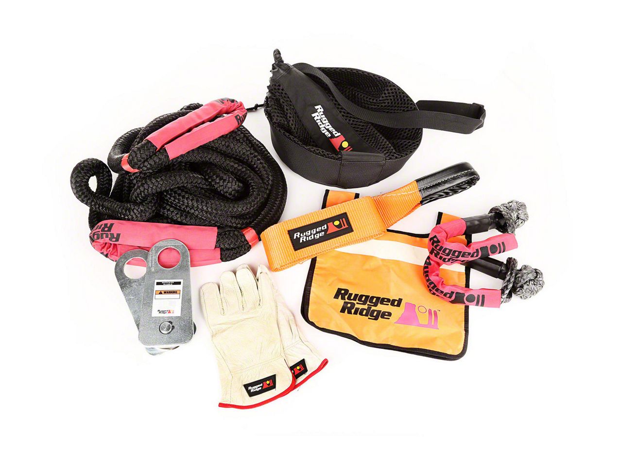 Complete Recovery Kit. Make yourself even more prepared for your next off-road trip with the Rugged Ridge Premium Recovery Kit with Mesh Bag. This kit has all the heavy-duty essentials needed for recovery jobs. Such tools include a recovery rope, a line dampener, work gloves, and a tree strap—all contained and organized in one durable mesh bag.