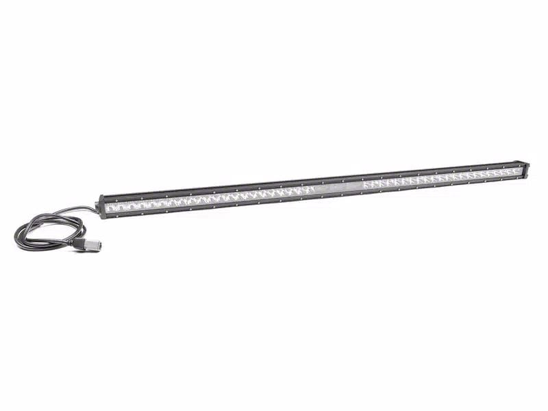 Description. The 50-Inch Single Row LED Light Bar from Rugged Ridge is a great way to equip your rig with night-cancelling illumination in a neat and efficient package. This single row night vision LED bar features a matte black cast aluminum housing that is IP68 waterproof rated for dependable performance in the harshest conditions. Highly efficient OSRAM LEDs create a combination flood / spot output with 10,800 raw lumens ideal for off-road driving, yet with a minimal 7.92-amp consumption, you’ve got the power to run all your other accessories. Includes wiring harness, relay, rocker switch, #304 stainless brackets, and hardware.