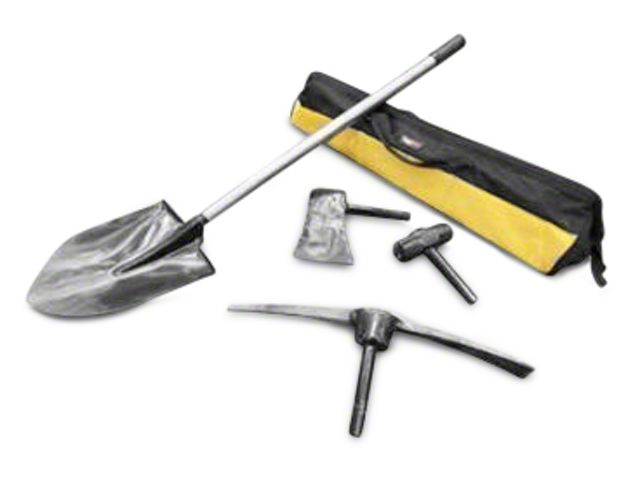 It's In There. The Rugged Ridge All Terrain Recovery Tool Kit includes a sturdy steel handle. That handle works with the four included high-quality tool heads. Tools included are an axe, pick-axe, shovel, and hammer. They securely attach to the handle when needed. Whatever you need to dig, chop, smash, or pound to get your rig back on your trail is included in this single Recovery Kit. And it all safely and compactly fits in a stylish and sturdy canvas bag that fits under or behind your F-150's seat.