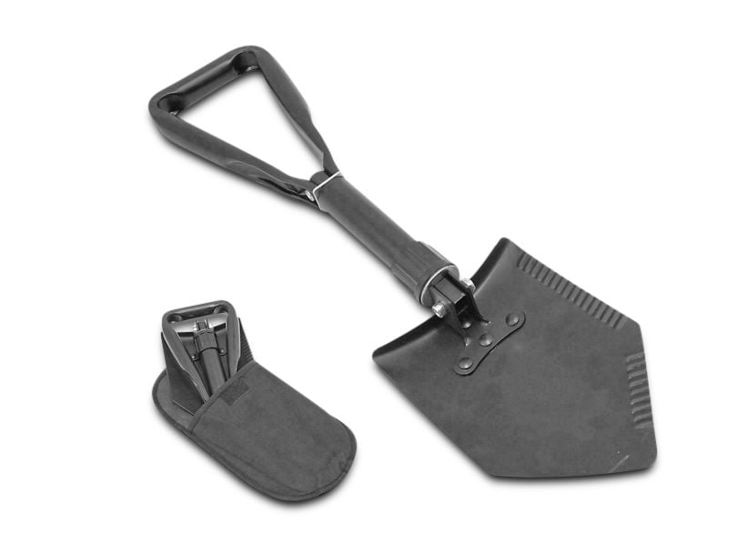 Collapsible Shovel. If you're an avid off-roader who often finds themselves in need of a tool that can cut and dig, but don't want to carry a full-sized shovel around, this Tri-Fold Recovery Shovel from Rugged Ridge is the perfect accessory. When opened, this shovel is an impressive 23 inches long, but it folds up into a convenient 9 inches when stored away. A handy durable storage case is also included.