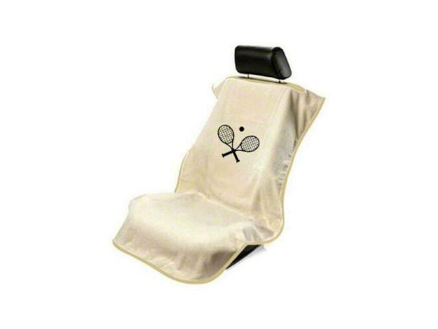 Comfort and Style. The Seat Towel with Crossed Tennis Racquets Logo Design offers a stylish and practical accessory for your vehicle. Featuring a cream tan finish and a soft poly-cotton material, this towel adds comfort and a sporty touch to your car’s interior.