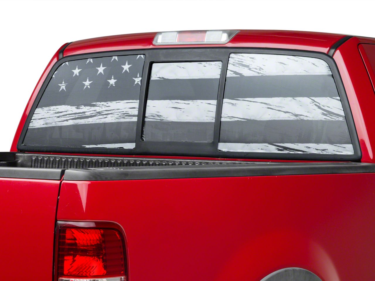 Patriotic Styling. If you're looking for a way to show your love for the USA, this Rear Window Decal is for you. Featuring a distressed matte black and white/light gray American Flag, this Perforated Rear Window Decal will proudly show off your patriotism. The flag graphic is visible from the outside of your vehicle, but you'll still be able to clearly see out the rear window when sitting inside.