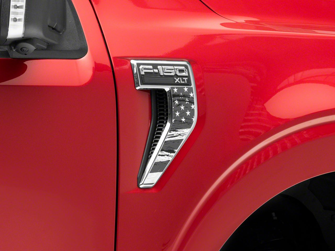 Patriotic Styling. Give your Ford F-150 a patriotic appearance upgrade with a pair of SEC10 Distressed US Flag Fender Grille Accent Decals. These black and white Distressed US Flag Decals will proudly show off your patriotism for everyone to see.
