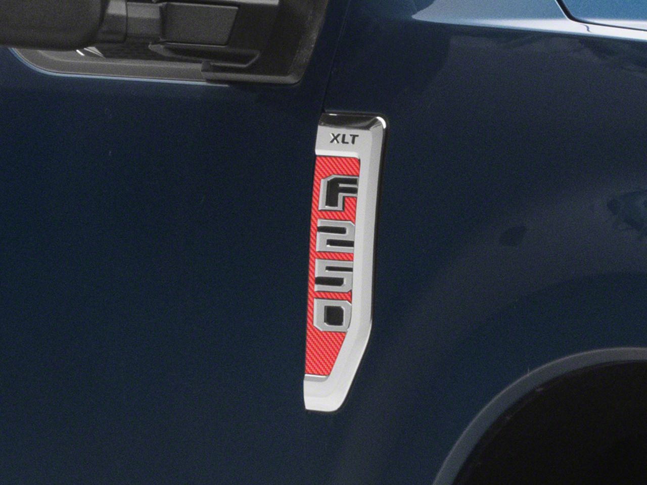 Application. These SEC10 Fender Badge Decals; Red Carbon are designed to fit 2017-2022 Ford F-250 Super Duty models. Driver and passenger side included.