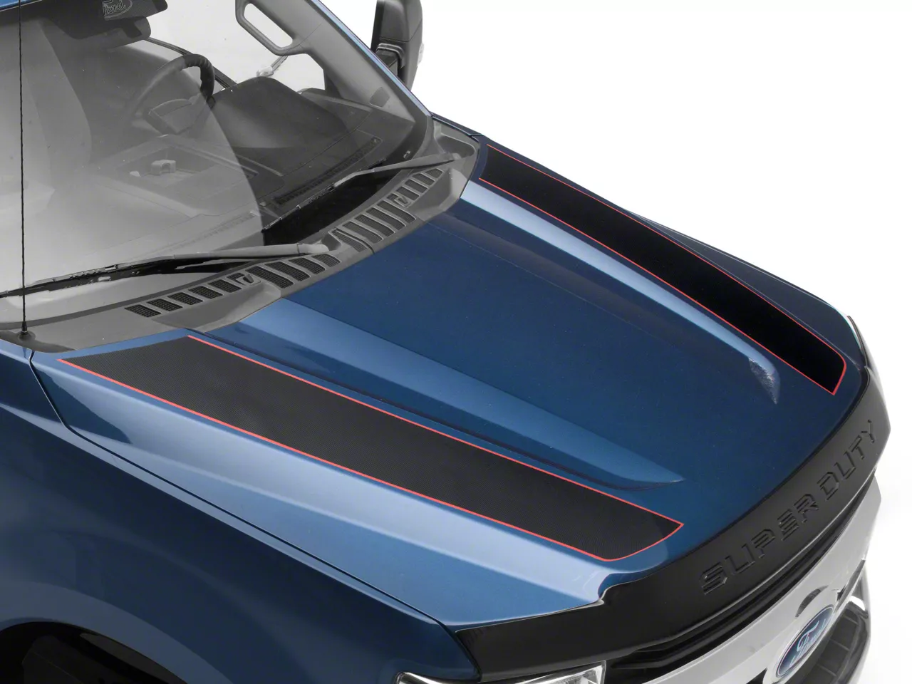 Dual Black Carbon Style Hood Stripes with Red Pinstripe. A great way to accentuate the clean lines of your F-250's factory hood is with a set of SEC10 Hood Decals. These Decals are a simple and inexpensive way to personalize the exterior styling of your truck.