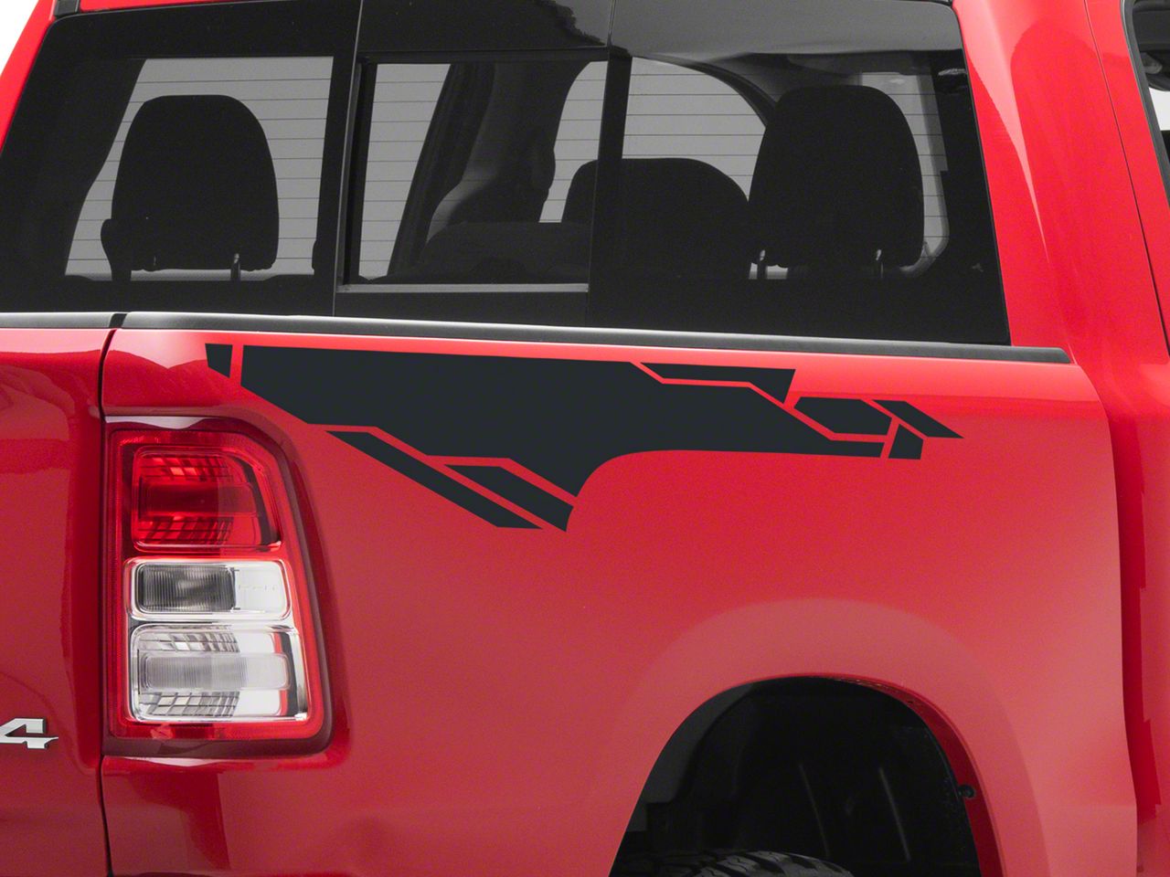 Bed Side Geometric Graphic Decals. A simple and inexpensive way to personalize the exterior styling of your RAM is with a set of SEC10 Bed Side Geometric Graphic Decals. These Decals feature a stylized geometric graphic design for sporty good looks.