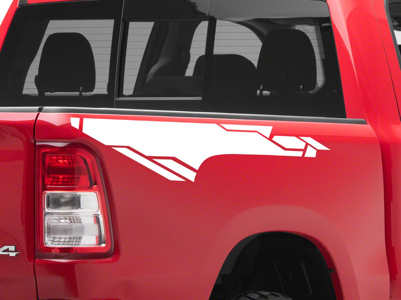 Bed Side Geometric Graphic Decals. A simple and inexpensive way to personalize the exterior styling of your RAM is with a set of SEC10 Bed Side Geometric Graphic Decals. These Decals feature a stylized geometric graphic design for sporty good looks.