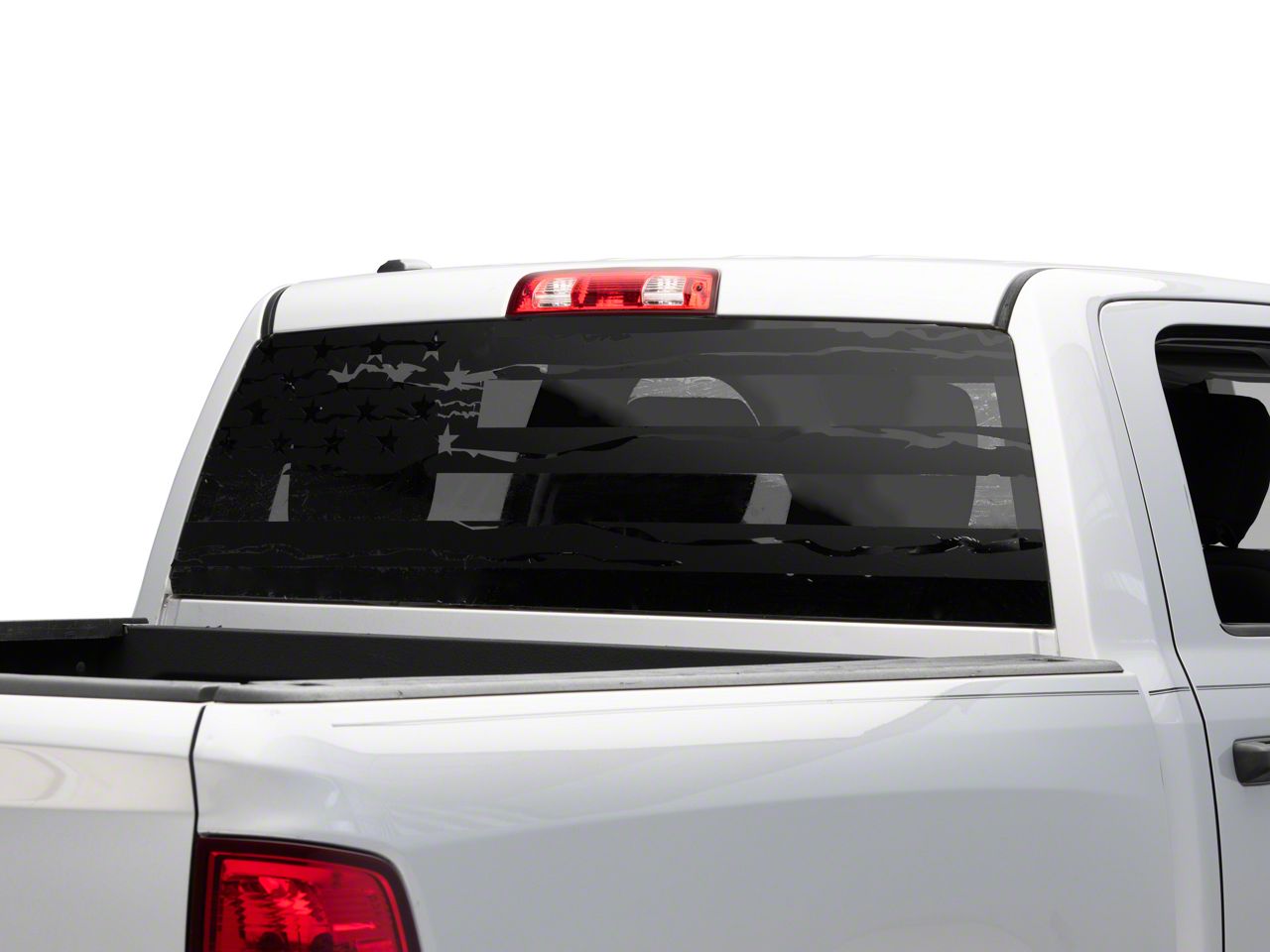 Application. This SEC10 Full Window Distressed American Flag Decal; Matte Black is designed to fit 1994-2026 RAM 1500 models. Please note that this rear window decal is designed to be applied to the outside of the glass only.