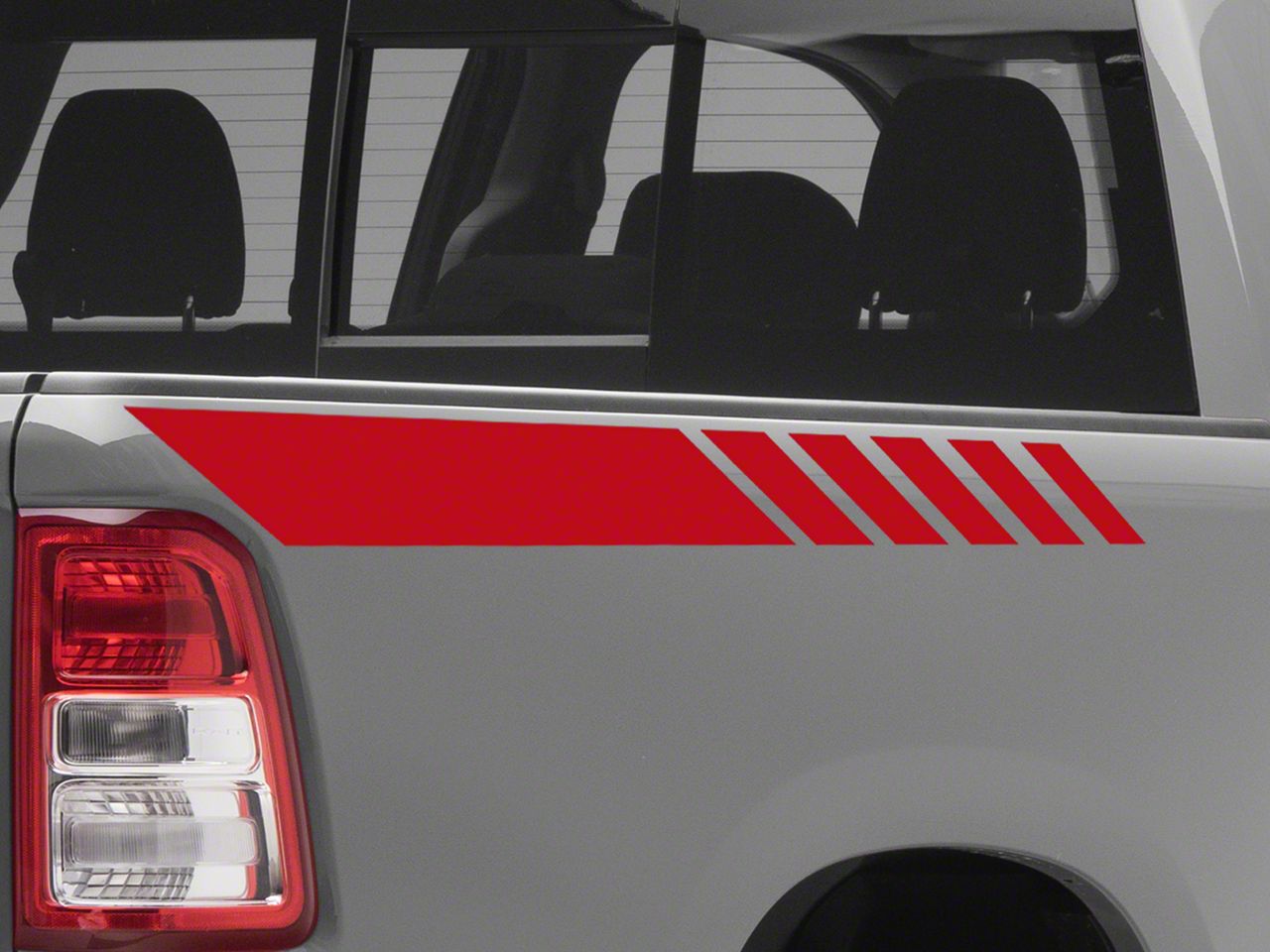 Application. These SEC10 Upper Bed Graphic; Red are designed to fit 1994-2026 RAM 1500 models. Driver and passenger side included.