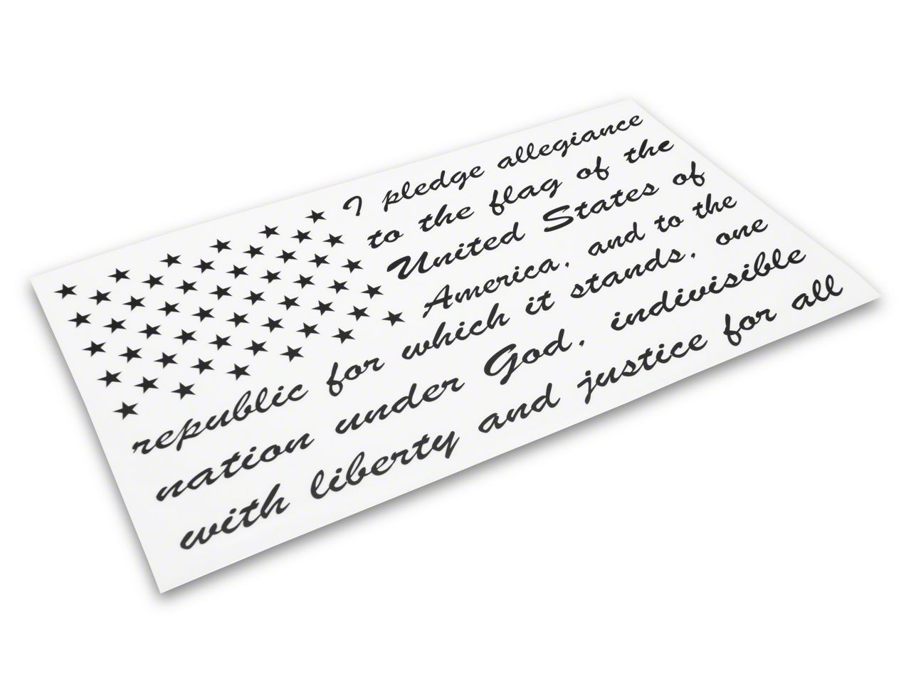 Pledge of Allegiance Flag Decal. Show that you are a proud American with this Pledge of Allegiance Flag Decal. Featuring the Pledge of Allegiance in an American Flag design, this Decal can be applied to any smooth flat surface and looks especially good in your rear/side windows or on your tailgate.