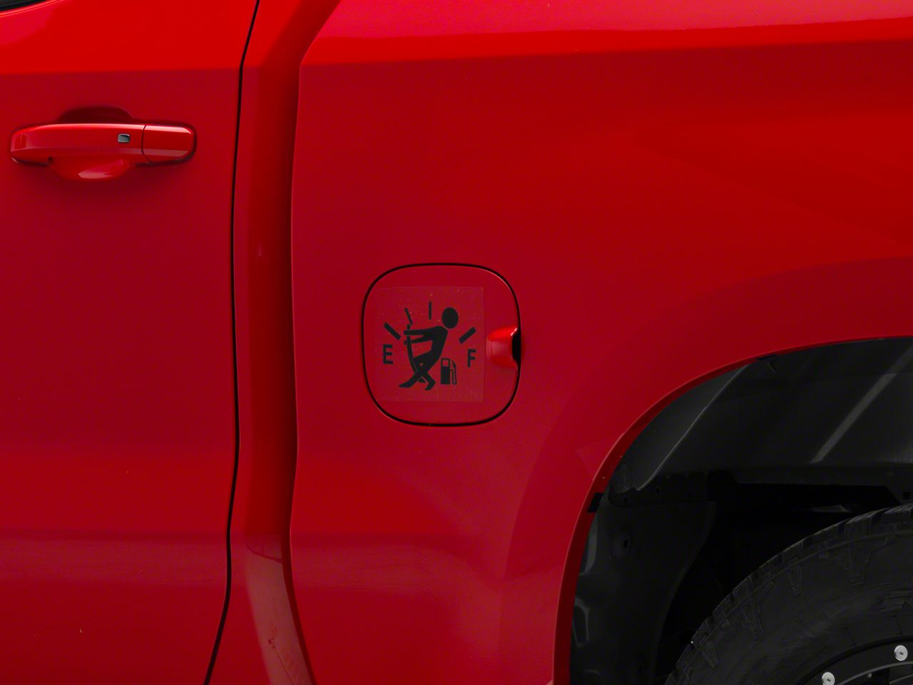 Empty Fuel Gauge Gas Guy Decal. This humorous decal shows the silhouette of a person fighting with the needle of their empty fuel gauge. This Decal can be applied to any smooth flat surface and looks especially good in your rear/side windows or on your tailgate.