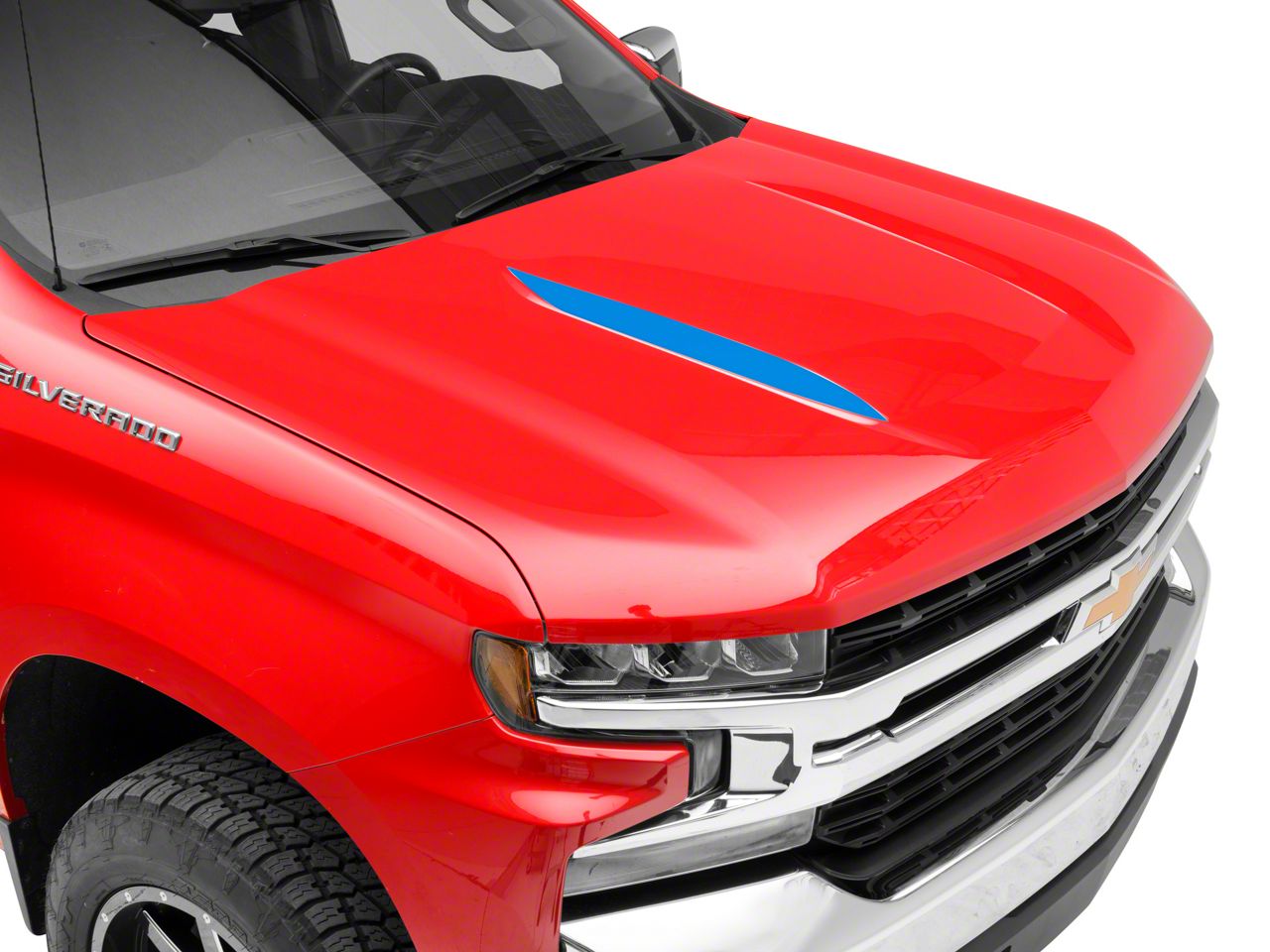 Bold Muscular Styling. A set of Blue Hood Accent Decals are a great way to add bold muscular styling to your 2019-2026 Chevrolet Silverado. Applying to either side of the center hood bulge, these SEC10 Hood Accent Decals will add a much more aggressive appearance to your Silverado.