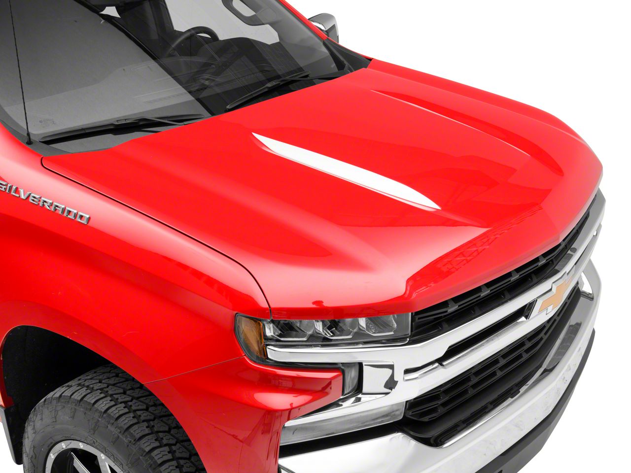 Bold Muscular Styling. A set of Silver Hood Accent Decals are a great way to add bold muscular styling to your 2019-2026 Chevrolet Silverado. Applying to either side of the center hood bulge, these SEC10 Hood Accent Decals will add a much more aggressive appearance to your Silverado.