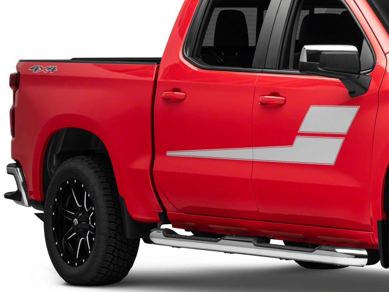 Application. These SEC10 Horizontal Side Stripes with Outer Pinstripe; Silver are designed to fit 1999-2026 Chevrolet Silverado 1500 models.