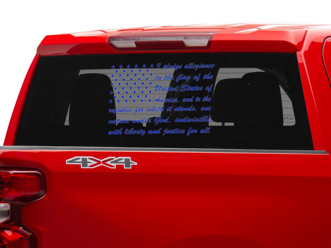 Pledge of Allegiance Flag Decal. Show that you are a proud American with this Pledge of Allegiance Flag Decal. Featuring the Pledge of Allegiance in an American Flag design, this Decal can be applied to any smooth flat surface and looks especially good in your rear/side windows or on your tailgate.
