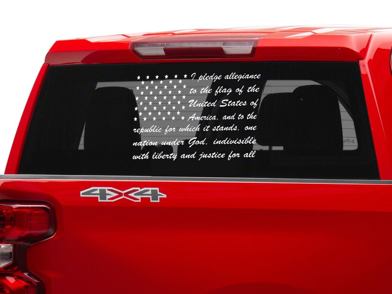 Pledge of Allegiance Flag Decal. Show that you are a proud American with this Pledge of Allegiance Flag Decal. Featuring the Pledge of Allegiance in an American Flag design, this Decal can be applied to any smooth flat surface and looks especially good in your rear/side windows or on your tailgate.