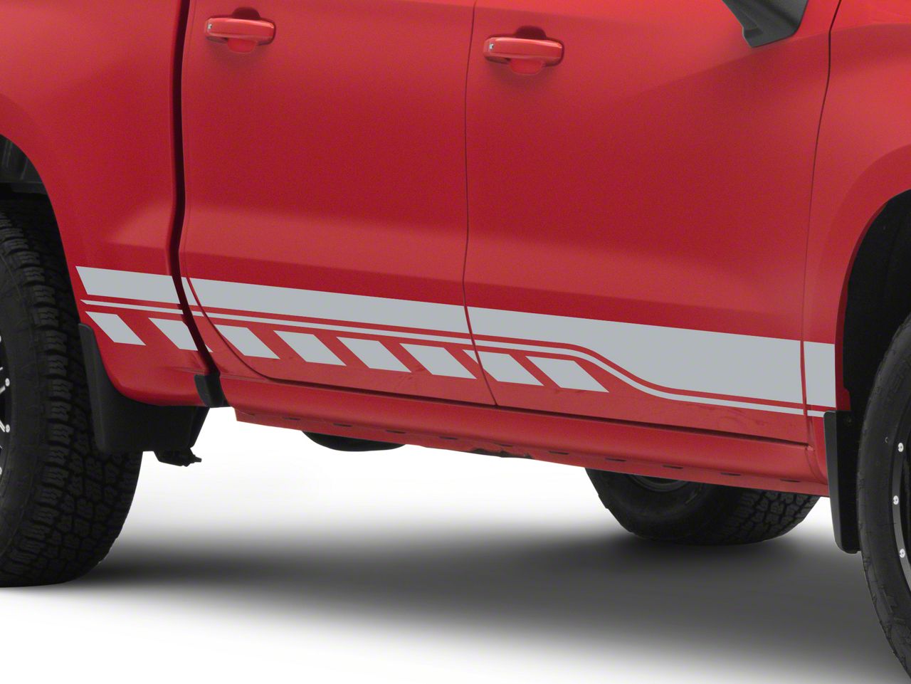 Application. These SEC10 Dash and Striped Rocker Stripes; Silverfeature a universal design and will fit most make and models. Driver and passenger side included.