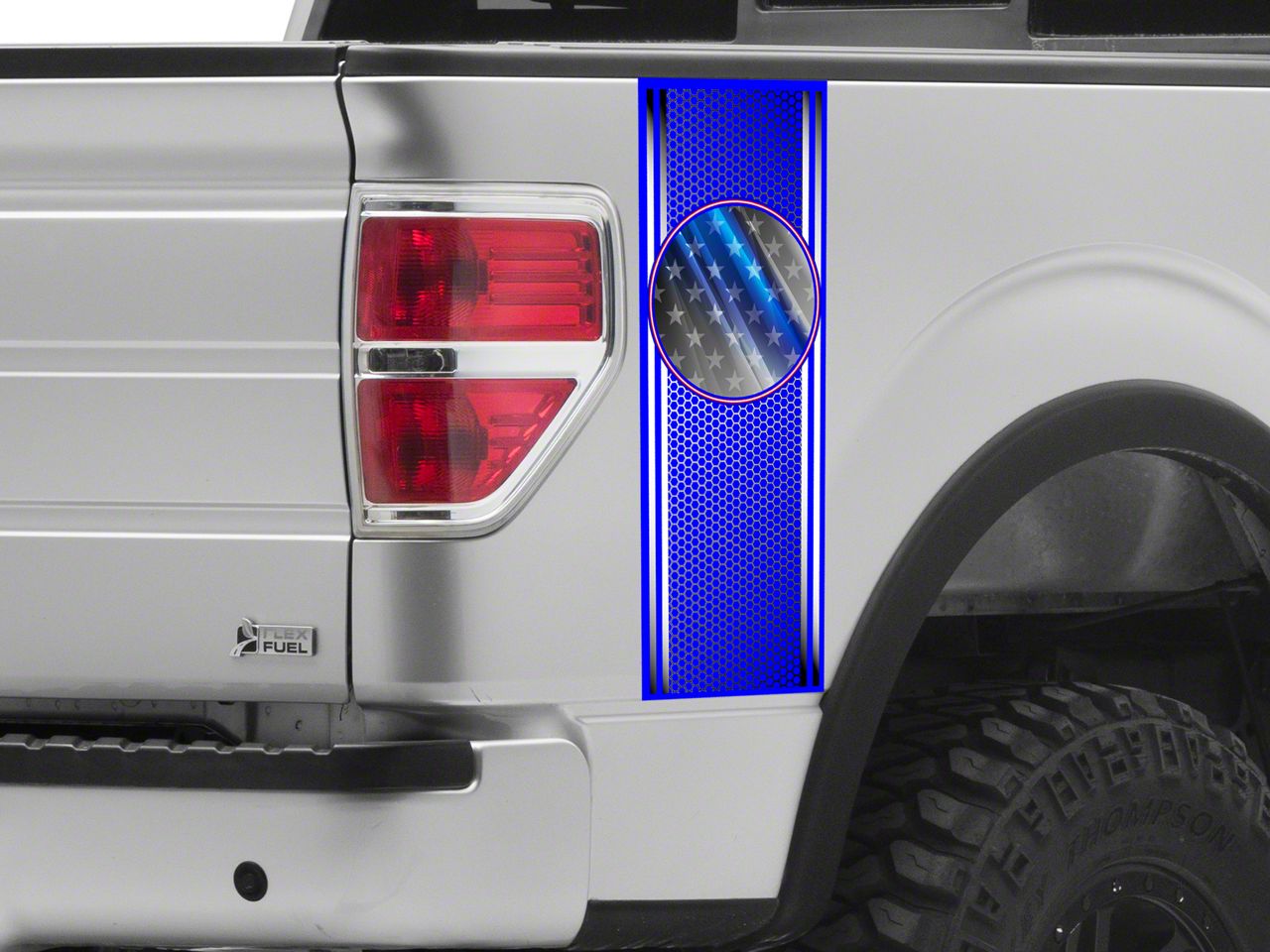 Police Department Vertical Bed Stripe Decals. These great looking SEC10 Vertical Bed Side Graphic Decals are an excellent way to show support for the men and women of the United States law enforcement agency's. These Bed Side Decals feature a fading honeycomb design with a circle showing the stars of the union.