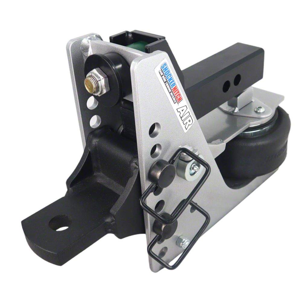 The Shocker Streamline aluminum air hitch with drawbar is ideal for quick hook up on trailers around the frame. The drawbar attachment comes with a 1″ hole for farm & wagon applications and is designed for towing trailers with drawbar & clevis pin tongues. (This is NOT for use with hitch ball). The aluminum hitch frame, 2″ receiver shank, and paddle offer a rust-free design that will perform great and will look good for years to come. The stout, yet lightweight aluminum hitch can handle up to 10,000 lbs gtw and won’t rust like steel hitches. The air ride design cushions the bumps, bangs, and jerks normally associated with towing on concrete highways, dirt roads, and around the farm and creates a smoother, safer trailer towing experience. The Shocker Aluminum Air Hitch with adjustable drawbar offers up to 4.5″ of drop and includes everything yet need, including three D-handle drawbar attachment pins with clips.The aluminum air hitch has a 10,000 lbs tow rating capacity and a 1,000 lbs tongue weight. The aluminum Shocker Air provides the ultimate smooth ride. This shock-absorbing hitch with an air spring bag is the best cushioning device on the planet. The Shocker Air is a miniature air ride suspension unit mounted between your truck and trailer. This Shocker mounts by sliding into a standard receiver tube. Fits Pickup Trucks, Vans, and Select SUVs with the receiver hitch tube mounted underneath the bumper. The air suspension system sits under the receiver tube allowing a short distance of 10 inches between the mounting pin and ball center. You will find the advantage of the Air Shocker is your ability to adjust air pressure for the best ride and load control. Manufactured by Shocker Hitch® USA in Jamestown, ND.