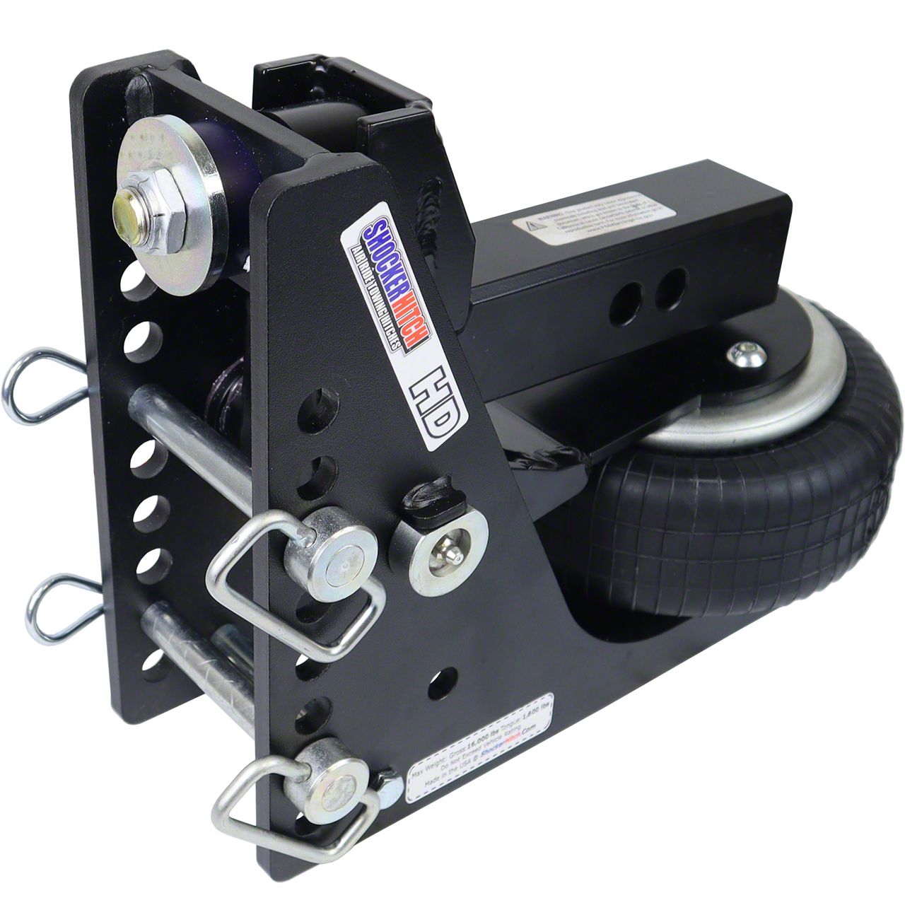 The Shocker Max Black HD Air Receiver Hitch base frame only. Includes everything except the ball mount attachment. Comes complete with 20K Shocker Max Black HD base frame assembly with built-in HD air ride system & 3 d-handle ball mount pins with clips. (No ball mount attachment included). 20+ ball mount attachments available & sold separately. The heavy-duty air ride suspension system can handle HD trailer towing with 20,000 lbs tow rating capacity and 2,000 lbs tongue weight. Shocker HD Air provides the ultimate smooth ride. With the shock dampening action, the heavy duty air hitch effectively absorbs the jerking, tugging and damaging forces experienced with a typical hard connection when towing trailers. There is no reason to beat yourself or your equipment up with a hard connection between your trailer and your receiver hitch. The simple pivoting design which produces a down and back motion, much different than other air hitches on the market. Our design eliminates the need for slides, parallel linkages, rollers, shock absorbers, or multiple air spring bags common to other cushion and air hitches. You get improved safety by giving you more control of your tow vehicle and trailer. The heavy duty air receiver hitch system allows for better control of your pickup and the trailer it is towing. Shocker HD max black air bumper hitch is designed with a built-in air ride system for a smoother towing experience. Featuring a built in height adjustment with 8 adjustment holes plus weight adjustable with the air ride system but adding or reducing air pressure for the best ride and load control. Just add or ride air depending on the weight of your trailer and it's contents. It also provide comfort with a smoother ride. Travel a lot on concrete highways? No more jarring every time you cross a section divider. Great for towing on dirt roads around the farm or ranch as well. Your Shocker HD air hitch absorbs the thumps and bumps.The Shocker HD Max Black Air is a miniature air suspension towing hitch mounted between your truck and trailer giving you safer and smoother towing on you, your tow vehicle, trailer and contents. This Shocker mounts by sliding into a standard receiver tube. Available ball mount attachments include combo ball, drop, raised, cushion draw bar, pintle hook, pintle & ball, clevis pin along with ball mounts with sway control tabs, which are sold separately.The air ride system sits under the receiver tube allowing a short distance of 10-inches between mounting pin and ball center. You will find the advantage of the Air Shocker is your ability to adjust air pressure for best ride and load control. Fits standard 2" receiver tube.The Shocker Max Black HD air base frame has a 20,000 lbs towing capacity and 2,000 lbs on tongue weight. Your rating may change depending on the ball mount used.
