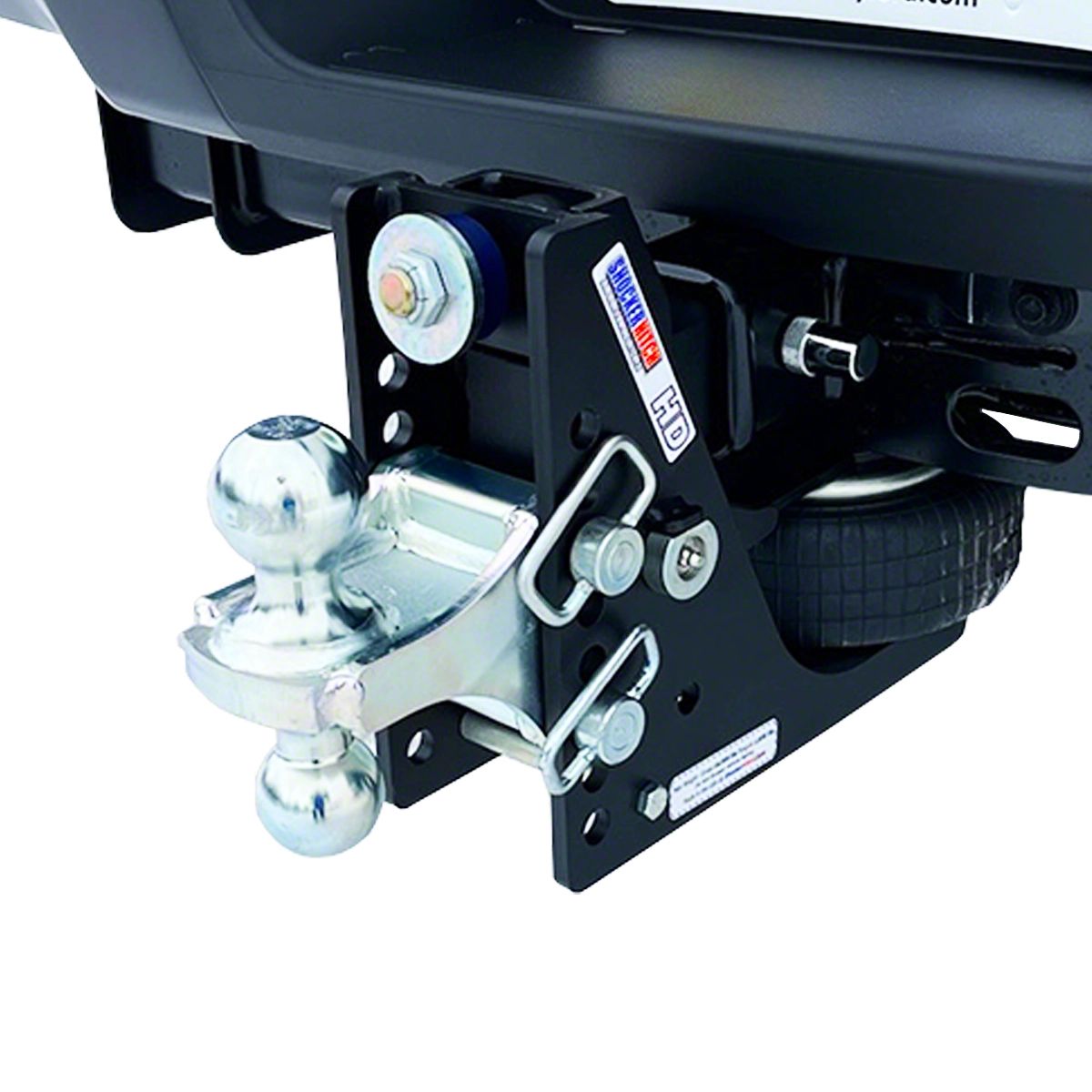 Description. The Shocker HD Max Black 20K Air Bag Receiver Hitch with combo multi-ball mount adds instant air ride your your tow vehicle and trailer and comes with the all new matte black premium powder-coat finish. This Max Black bumper mount air hitch from Shocker Hitch has both a 2"" hitch ball and a 2-5/16"" hitch ball with a 1/2"" to 4-1/2"" Drop. 20,000 lbs tow rating capacity and 2,000 lbs tongue weight. Instantly add air ride towing for your pickup and trailer. This heavy-duty shock absorbing hitch & ball mount cushions the ride and takes the bumps and bangs out of towing. Shocker HD bumper style air hitch provides the ultimate smooth ride when you're towing. The Shocker Air is a miniature air suspension unit mounted between your truck and trailer. The built in HD airbag absorbs the road shock, reducing the tendency of trailer sway and cushions your ride. The built in dual bump cushions also taken bangs and bumps of the road for additional extra duty performance. You can fine tune the air pressure for the weight of your trailer. This Shock absorbing air ride cushion hitch mounts by sliding into a standard receiver tube. Shocker air hitch effectively absorbs the jerking, tugging and damaging forces experienced with a typical hard connection when towing trailers. There is no reason to beat yourself or your equipment up with a hard connection between your trailer and your receiver hitch. Upgrade to smooth, safer towing. This air hitch cushions the ride for you, your trailer and the trailer contents. Great for all around heavy-duty bumper hitch towing. Made by Shocker Hitch USA in Arthur, ND.