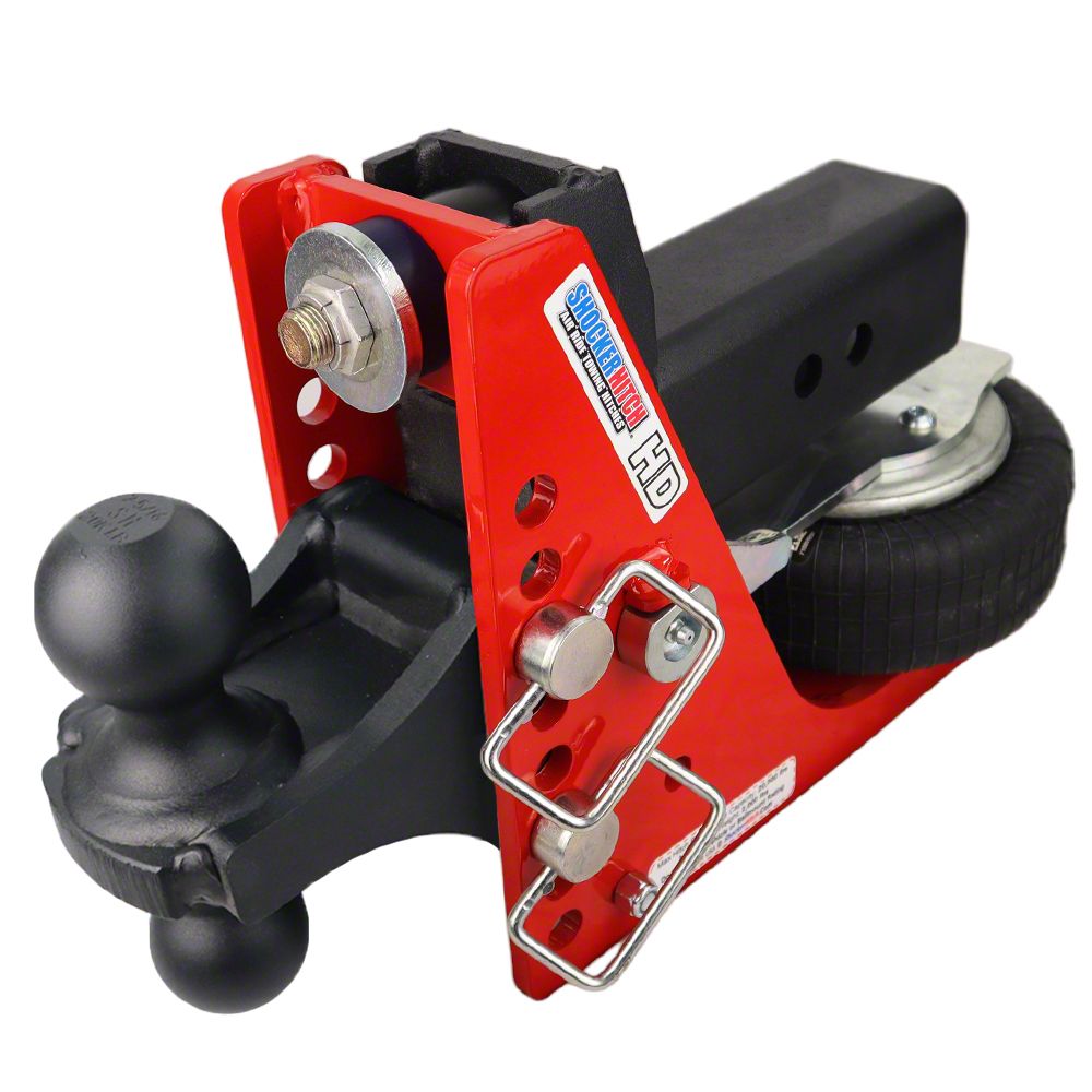 The Shocker HD™ 20K air ride system Receiver Hitch with combo multi-ball mount with both a 2" hitch ball and a 2-5/16" hitch ball with a 1/2" to 4-1/2" Drop. 20,000 lbs tow rating capacity and 2,000 lbs tongue weight. Instantly add air ride towing for your pickup and trailer. This heavy-duty shock absorbing hitch & ball mount cushions the ride and takes the bumps and bangs out of towing.  Shocker HD bumper style air hitch provides the ultimate smooth ride. The Shocker Air is a miniature air suspension unit mounted between your truck and trailer. You can fine tune the air pressure for the weight of your trailer. This Shock absorbing air ride cushion hitch mounts by sliding into a standard receiver tube.  Made for pickup trucks only.  Shocker air hitch effectively absorbs the jerking, tugging and damaging forces experienced with a typical hard connection when towing trailers. There is no reason to beat yourself or your equipment up with a hard connection between your trailer and your receiver hitch. Upgrade to smooth, safer towing.  This air hitch cushions the ride for you, your trailer and the trailer contents. Great for all around heavy-duty bumper hitch towing.The combo ball mount features welded hitch balls for superior strength and the combo ball mount comes in a silver powder coat finish. By reducing wear and tear on driveline and frame! Treat yourself, your equipment, and your passengers to a much smoother ride. You’ll never go back to the ‘old days’ of continual bumps, jerks, and vibrations. Join the list of satisfied customers that are using Shocker HD air hitches. Get ready for your ultimate smooth towing experience the next time out.The 20K air ride system sits under the receiver tube allowing a short distance of 10-inches between mounting pin and ball center. You will find the advantage of the Air Shocker is your ability to adjust air pressure for best ride and load control. The Shocker HD is 20,000 lbs towing capacity and 2,000 lbs on tongue weight.Quality Manufacturing: With the combo adjustable ball mount, the hitch balls are manufactured together – one piece construction for maximum strength and durability. Featuring a silver powder coat finish for resistance to the elements.Air Ride Hitch: Shocker Air is designed with a built-in air ride system for a smoother towing experience. Featuring a built in height adjustment plus weight adjustable. Just add or ride air depending on the weight of your trailer and it's contents.Provide Comfort: With a smoother ride! Travel a lot on concrete highways? No more jarring every time you cross a section divider. Your Shocker air hitch absorbs the thumps and bumps.Simple Pivot Design: uses a rocker arm pivot design which produces a down and back motion, much different than other air hitches on the market. Our design eliminates the need for slides, parallel linkages, rollers, shock absorbers, or multiple air ride systems common to other air hitches.Improves Safety: By giving you improved control of your tow vehicle and trailer. The air ride system receiver hitch system allows for better control of your pickup and the trailer it is towing.Saves Money: By reducing trailer breakage on both the trailer and the trailer contents! The Shocker hitch absorbs the damaging forces experienced with a typical hard connection. This greatly reduces the chances of breaking welds and doing other long term damage to your equipment as well as the valuable cargo you have inside the truck and trailer.Adds Life To Your Vehicle: By reducing wear and tear on driveline and frame! Treat yourself, your equipment, and your passengers to a much smoother ride. You’ll never go back to the ‘old days’ of continual bumps, jerks, and vibrations. Join the list of satisfied customers that are using Shocker hitches. Order one today and get ready for your ultimate smooth towing experience the next time out.Tons of Attachments: We offer a wide variety of our ball mount attachments; standard mounts, drop ball mounts, clevi