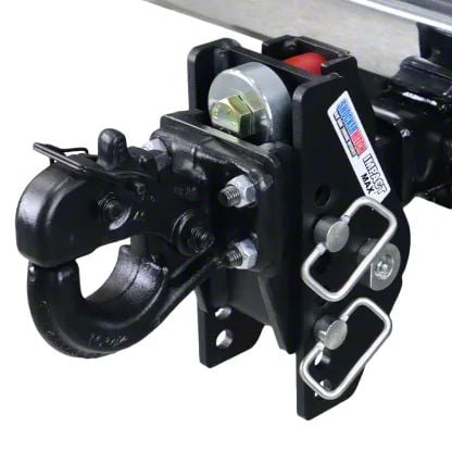 This 20K heavy-duty adjustable, dual cushion shock absorbing adjustable pintle hitch is great for farm, contractor and heavy-duty trailer towing applications.  The cushion hitch features a shock absorbing pivoting design that absorbs the bumps, bangs, jerks and tugs normally experienced when towing trailers with a pintle ring and creates smoother trailer towing. It's idea on pickups pulling dump, skid steer, equipment and military trailers with a pintle ring on the front. Featuring over 10 inches of adjustment. Adjustable pintle hook has either 1" Rise to 6-1/2" drop. The all black Shocker Impact Max™ cushioning pintle hook ball mount is designed to absorb road shock and cushion your trailer towing experience.  This hitch can be flipped around for more drop or rise.  The dual bump cushion design pintle hitch is rated up to 20,000 lbs towing and 2,000 lbs tongue weight and also includes a 10-ton pintle hook. Featuring a heavy-duty pintle hook to fit a 6" OD x 3" ID pintle ring.   Plus the shocker pintle hook hitch is designed and made for a nice, tight fit with your pintle ring. This Impact Max cushioned pintle hitch ball mount attaches to your truck by sliding into a standard receiver tube. Available for 2", 2-1/2" or 3" receiver.  Use this adjustable pintle hitch ball mount however you need to for tons of versatility. This military style HD towing hitch is great for contractors pulling skid steer, dump and tilt trailers, around the farm and off-road overland towing as well as other heavy-duty trailer towing applications. Built-in dual bump cushions, absorbing both the up or down & forward or backward jerks and tugs you experience towing creating a smoother towing experience. Made by Shocker Hitch® USATons of Attachments: We offer a wide variety of our ball mount attachments; standard mounts, drop ball mounts, clevis mounts, drawbar mounts, cushioned drawbar mounts, attachments, raised mounts and combo multi-ball mounts.