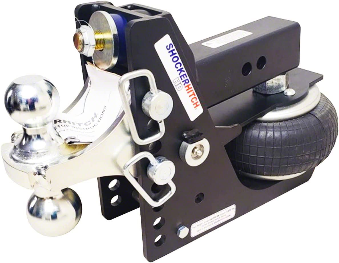 Description. The Shocker HD Max Black 20K Air Bag Receiver Hitch with combo multi-ball mount adds instant air ride your your tow vehicle and trailer and comes with the all new matte black premium powder-coat finish. This Max Black bumper mount air hitch from Shocker Hitch has both a 2"" hitch ball and a 2-5/16"" hitch ball with a 1/2"" to 4-1/2"" Drop. 20,000 lbs tow rating capacity and 2,000 lbs tongue weight. Instantly add air ride towing for your pickup and trailer. This heavy-duty shock absorbing hitch & ball mount cushions the ride and takes the bumps and bangs out of towing. Shocker HD bumper style air hitch provides the ultimate smooth ride when you're towing. The Shocker Air is a miniature air suspension unit mounted between your truck and trailer. The built in HD airbag absorbs the road shock, reducing the tendency of trailer sway and cushions your ride. The built in dual bump cushions also taken bangs and bumps of the road for additional extra duty performance. You can fine tune the air pressure for the weight of your trailer. This Shock absorbing air ride cushion hitch mounts by sliding into a standard receiver tube. Shocker air hitch effectively absorbs the jerking, tugging and damaging forces experienced with a typical hard connection when towing trailers. There is no reason to beat yourself or your equipment up with a hard connection between your trailer and your receiver hitch. Upgrade to smooth, safer towing. This air hitch cushions the ride for you, your trailer and the trailer contents. Great for all around heavy-duty bumper hitch towing. Made by Shocker Hitch USA in Arthur, ND.
