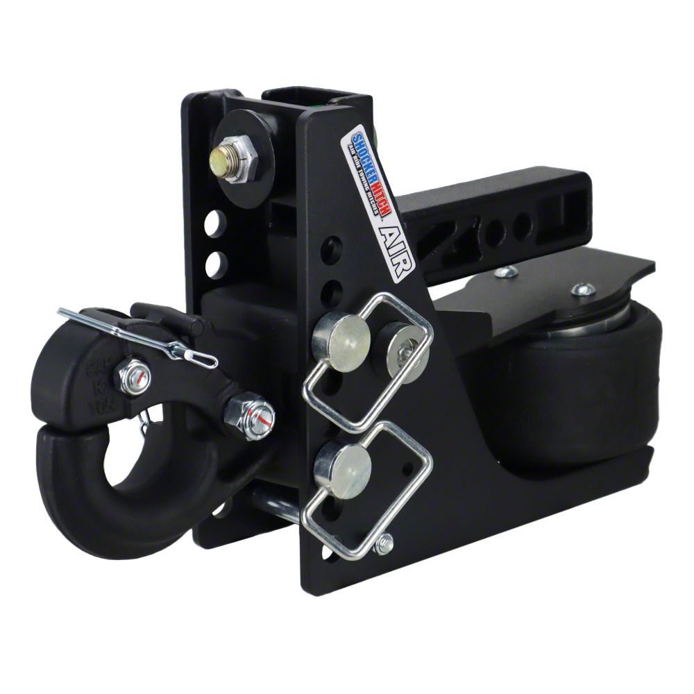 The Shocker Max Black Air Pintle Hook Receiver Hitch is the most durable air pintle hitch on the market. Crafted for longevity, its 14K base frame features an impact-resistant textured matte black finish designed to withstand years of use. Comes adjustable pintle hook hitch that can handle up to 10 tons (20,000 lbs) and incorporates a built-in air ride system for a remarkably smooth towing experience. With eight adjustment holes, that offers 3" to 7" Drop. Great for contractors and military pulling trailers with pintle rings. Reduces breakage, saves money, creates smoother towing and is easier on you and your equipment. Also works great for overlanding trailers for trailer towing on uneven terrain.The Shocker functions as a compact air suspension unit between your truck and trailer, enhancing the towing experience for pickups, trailers, and their contents. It easily mounts into standard receiver tubes, making it ideal for heavy-duty hauling, farm equipment, and military-style towing. Included is a pintle hook that simplifies attachment to trailers with a pintle ring, compatible with 6" OD x 2-1/2" to 3" ID pintle rings. This adjustable pintle hitch excels in farm and heavy-duty contractor applications, offering quick hookups and a smooth ride when pulling trailers with pintle rings such as equipment, tilt, dump and skid steer trailers.Designed to minimize slop, the adjustable pintle's construction and air ride system work together to enhance towing performance. It’s commonly used on military, farming, contractor trailers, and off-road overlanding applications, fitting pickups, vans, and select SUVs with under-bumper receiver tubes. Proudly manufactured by Shocker Hitch® USA in Jamestown, ND, it boasts a towing capacity of 14,000 lbs and a tongue weight of 1,400 lbs.Note: Don't go over the GTW of the base hitch as this hitch is rated at 14,000 lbs. The air ride system is positioned beneath the receiver tube, providing a compact 10-inch distance between the mounting pin and ball center. The adjustable air pressure allows you to optimize ride quality and load control, compatible with standard 2" receivers.