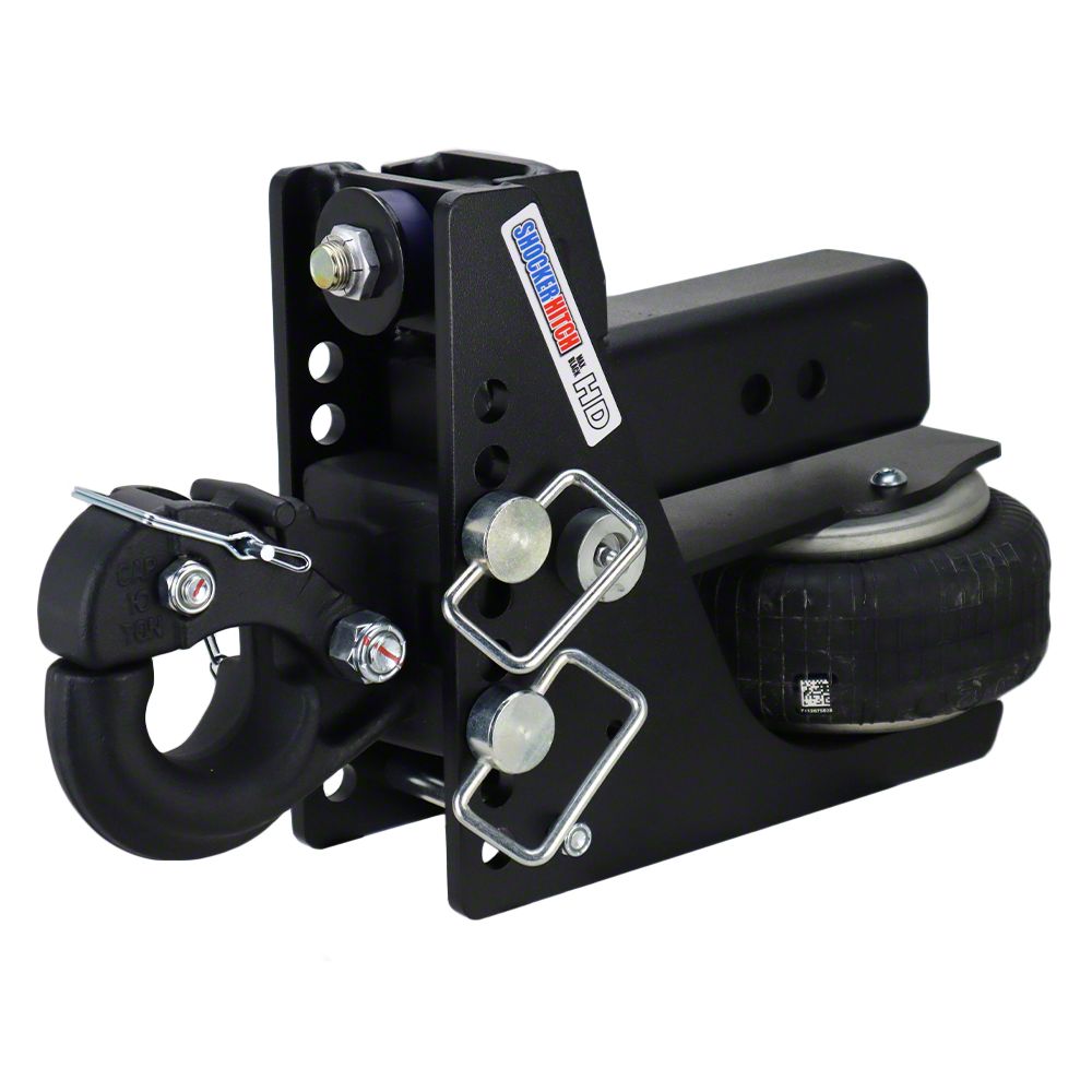 The Shocker HD Max Black Air Pintle Hook Receiver Hitch is the toughest air pintle hitch around. Built to last the HD base frame is finished with an impact-resistant textured matte black finish that will last for years to come. This 10-Ton 20,000 lbs Max Black HD adjustable pintle hook hitch has a built-in air ride system that provides the ultimate smooth towing experience. 8 Adjustment holes that allow for 3" to 7" Drop. The Shocker Air is a miniature air suspension unit mounted between your truck and trailer. This gives you a smooth towing experience for your pickup, trailer and contents. This Shocker mounts by sliding into a standard receiver tube and is built for heavy-duty hauling, equipment, tilt, dump and skid steer trailers, toter homes along with farm equipment, and military-style towing equipment, off road & overlanding trailers. The Max Black HD Pintle Comes with a pintle hook for easy attachment and hook up to a trailer with a pintle ring. This pintle hook fits 6" OD x 2.5-3" ID pintle rings. Great for farm and heavy-duty contractor towing applications for quick hookup and smooth towing. This adjustable pintle has a nice fix because of the design reducing slop and the built-in air ride system smooths out your towing. Often used on-farm applications, contractor trailers, and off-road trailers and works great on pickups, vans, and select SUV's with the receiver tube under the bumper. Designed for 2.5" receiver hitch. Manufactured by Shocker Hitch® USA in Jamestown, ND. 20,000 lbs tow rating capacity and 2,000 lbs tongue weight.The HD air ride system sits under the receiver tube allowing a short distance of 10-inches between mounting pin and ball center. You will find the advantage of the HD Air Shocker is your ability to adjust air pressure for best ride and load control.