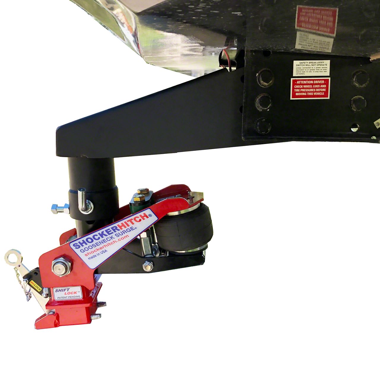Air ride upgrade for 5th wheel camper trailers. Experience safer, smoother towing. Upgrade your 5th wheel camper with a gooseneck pin box and Shocker Quick Air™ gooseneck air hitch and coupler.  This conversion kit comes complete with a heavy duty steel replacement gooseneck pin box along with a complete Shocker gooseneck air hitch with shift lock coupler for a 2-5/16" gooseneck ball. Get smoother safer towing along with faster hookups and disconnects with the Shocker Quick Air™ 5th wheel to gooseneck conversion kit. The built in air ride system cushions your truck and camper and absorbs the road shock giving you a much nicer towing experience.  Since it's air ride, you can simply adjust the air pressure for when your camper is loaded or unloaded. Featuring up to 6,000 lbs tongue weight and 24,000 lbs gross trailer weight.  The patented and additional Patented Shocker Gooseneck Surge® air hitch with shift lock coupler is the ultimate in gooseneck trailer towing for your rv camper. This shock absorbing cushion hitch is the only air ride hitch to exclusively work in a forward and back motion, which is often times this is the biggest jerk you feel when towing your 5th wheel rv camper trailer.  The built in air ride system absorbs the road shock and filters the bumps through the air ride system creating a smoother, safer towing experience for you, your pickup, your trailer & the contents. Replaces the need for bulky in truck bed 5th wheel sliders. Featuring the patented revolutionary 24K Shift Lock™ Coupler for 2-5/16" gooseneck ball.  Whether you are a occasionally tow or are going camping all over the country, this 5th wheel to gooseneck system  adds instant air ride to your towing.  Gooseneck pin box available for these 5th wheel campers with Lippert 1621, 0719 or Rhino Box Choose with or without safety chain kit.  A safety chains are require with gooseneck hitch towing.Note: This gooseneck hitch has a shorter stem then a normal gooseneck and is designed for to be used with the Shocker Replacement Gooseneck Box for 5th Wheel Campers only. This gooseneck air hitch cannot be used on a normal gooseneck trailer as the inner tube steel is too short for that application.