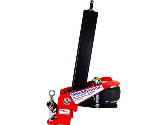 Description. The Gooseneck Surge air hitch & coupler adds instant air ride to your gooseneck trailer. This gooseneck air hitch is the only air ride hitch to exclusively work in a forward and back motion, which is often times this is the biggest jerk, tug and bang you feel when towing gooseneck trailers. The Shocker air gooseneck surge hitch directs the tow resistance through the airbag, producing a way smoother ride and towing experience. The Gooseneck Surge hitch is the ultimate hitch for gooseneck trailers. It provides smooth and safe towing experience. Featuring the exclusive patent pending Shift Lock gooseneck coupler with 30,000 lbs tow & 6,000 lb tongue weight rating.