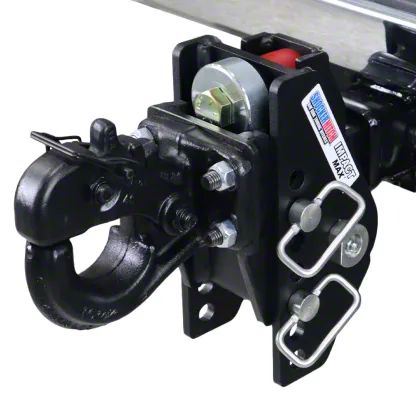 This 20K heavy-duty adjustable, dual cushion shock absorbing adjustable pintle hitch is great for farm, contractor and heavy-duty trailer towing applications. The cushion hitch features a shock absorbing pivoting design that absorbs the bumps, bangs, jerks and tugs normally experienced when towing trailers with a pintle ring and creates smoother trailer towing. It's idea on pickups pulling dump, skid steer, equipment and military trailers with a pintle ring on the front. Featuring over 10 inches of adjustment. Adjustable pintle hook has either 3" drop to 6-1/2" drop. The all black Shocker Impact Max™ cushioning pintle hook ball mount is designed to absorb road shock and cushion your trailer towing experience. This hitch can be flipped around for more drop or rise. The dual bump cushion design pintle hitch is rated up to 20,000 lbs towing and 2,000 lbs tongue weight and also includes a 10-ton pintle hook. Featuring a heavy-duty pintle hook to fit a 6" OD x 3" ID pintle ring. Plus the shocker pintle hook hitch is designed and made for a nice, tight fit with your pintle ring. This Impact Max cushioned pintle hitch ball mount attaches to your truck by sliding into a standard receiver tube. Designed for 2" receiver. Use this adjustable pintle hitch ball mount however you need to for tons of versatility. This military style HD towing hitch is great for contractors pulling skid steer, dump and tilt trailers, around the farm and off-road overland towing as well as other heavy-duty trailer towing applications. Built-in dual bump cushions, absorbing both the up or down & forward or backward jerks and tugs you experience towing creating a smoother towing experience. Made by Shocker Hitch® USATons of Attachments: We offer a wide variety of our ball mount attachments; standard mounts, drop ball mounts, clevis mounts, drawbar mounts, cushioned drawbar mounts, attachments, raised mounts and combo multi-ball mounts.