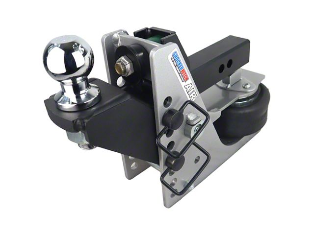 Advanced Towing Solution. Elevate your towing experience with the Shocker Hitch Receiver Hitch and Raised Ball Mount. This hitch system is designed to handle a maximum gross trailer weight of 10,000 pounds and a maximum tongue weight of 1,000 pounds, making it suitable for a wide range of towing applications. The unit features a matte black and polished chrome finish for durability and style. Its unique design incorporates a built-in shock absorbing air spring bag with dual rubber bump cushions, which effectively eliminates tugs, thumps, jerks, and bumps, enhancing overall towing smoothness and safety.